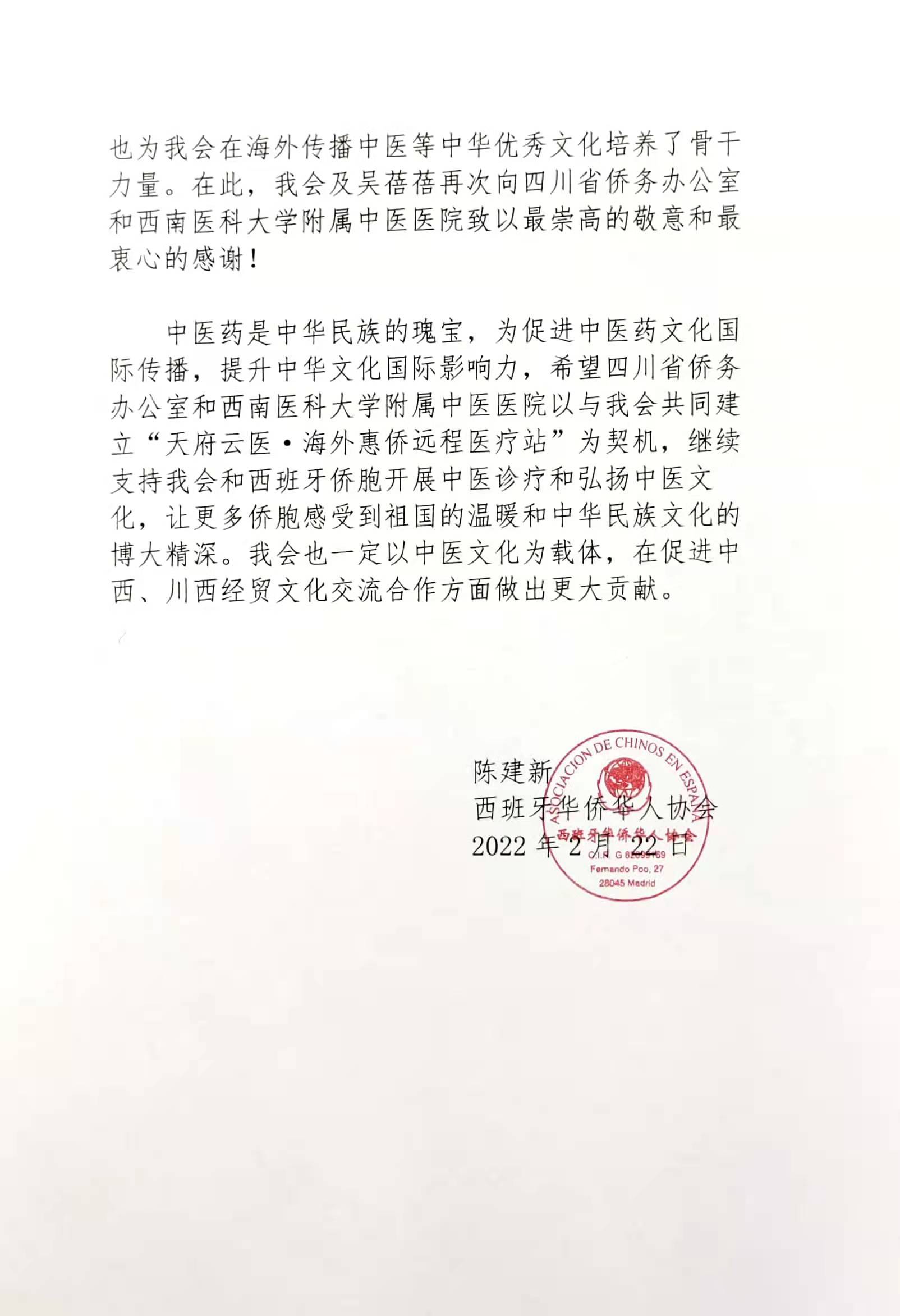 2022年2月25日,西班牙华侨华人协会向kaiyun官方网站入口附属中医医院发来感谢信,对kaiyun官方网站入口附属中医医院为西班牙华侨吴蓓蓓提供中医临床实习机会以及实习期间无微不至的关心与照顾表示感谢。同时,对kaiyun官方网站入口附属中医医院为其在海外传播中医等中华优秀文化培养骨干力量表达了崇高的敬意。