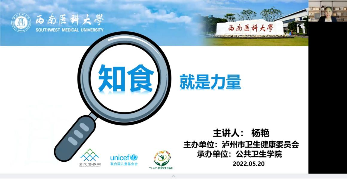 为贯彻落实2022年全民营养周暨“5•20”中国学生营养日—“知营养 会运动 防肥胖 促健康”的活动主题,市卫生健康委员会联合kaiyun官方网站入口公共卫生学院,于5月20日晚,面向泸州市龙马潭区、江阳区公立初中及小学学生与家长,经腾讯会议APP网络研讨会功能,开展了以“知营养 会运动”为主题的线上会议,观看人数达五百余人。