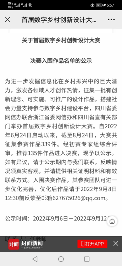 数字乡村是乡村振兴的战略方向,也是建设数字中国的重要内容。为贯彻落实党中央国务院关于乡村振兴战略的部署要求,深入实施《数字乡村发展战略纲要》和《数字乡村发展行动计划(2022-2025年)》,进一步发掘信息化在乡村振兴中的巨大潜力,加快数字乡村建设,打造一批可复制推广的数字乡村样板,四川省委网信办在中央网信办信息化发展局等国家部委司局的指导下,联合浙江省委网信办和四川省直有关部门举办主题为“数字赋能乡村振兴 创新引领智绘未来”的首届数字乡村创新设计大赛。