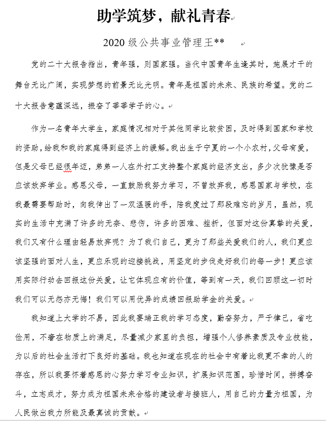 此次活动旨在让广大受助学子认真学习党的二十大精神,感恩国家资助、领悟教育意义、奉行强国之举、贡献一己之力。活动发布便收到了大量征文作品,参赛同学用文字写下对于党和国家资助政策的感恩之情,感恩党和国家在他们的求学路上撑起了一把绿伞,助力梦想远行。同时,他们以生动质朴的语句立下誓言,决心为祖国伟大事业的建设贡献自己的一份力量。