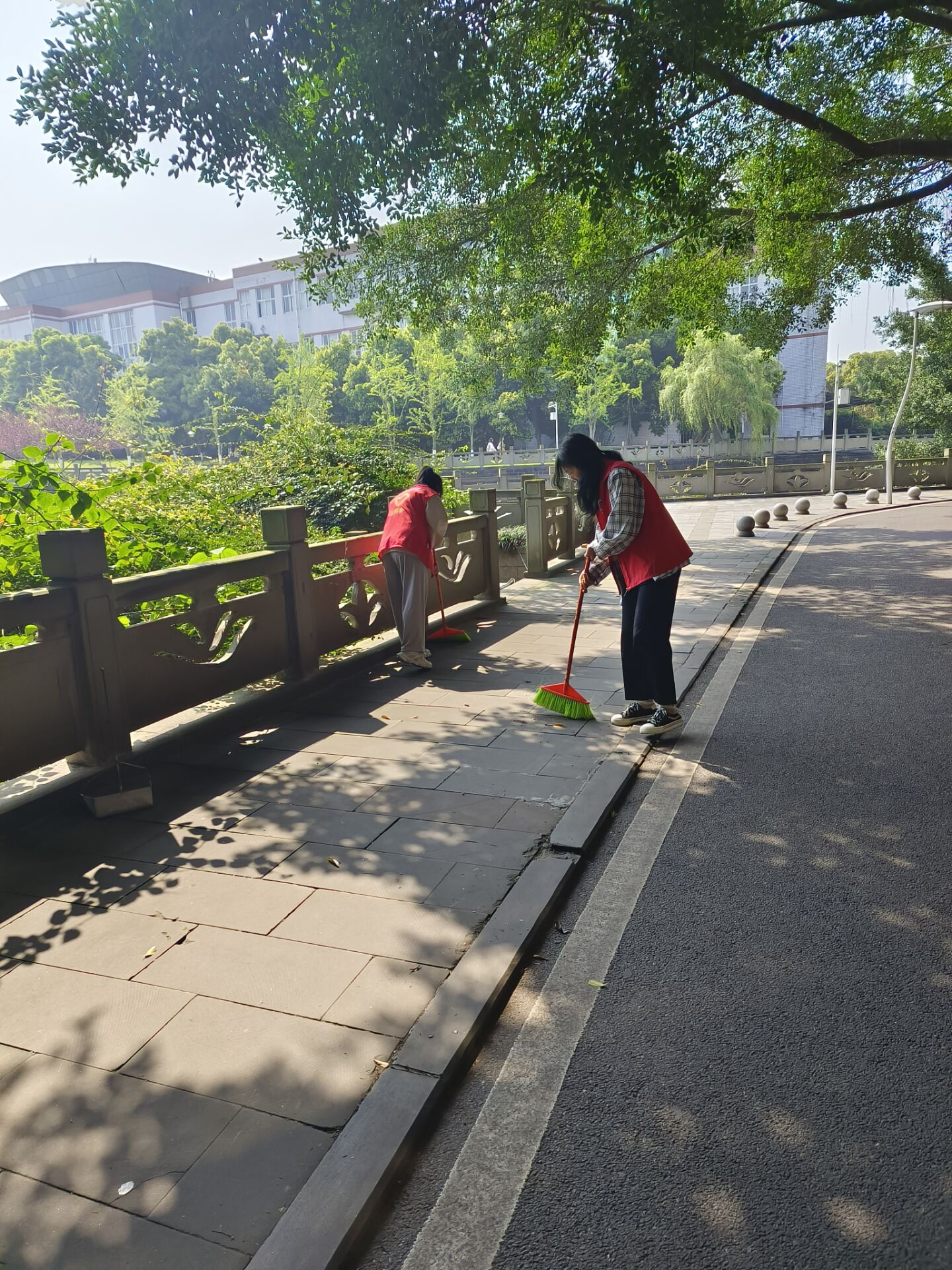 本次志愿服务时间为上午9:00-11:00和下午15:00-17:00两个时间段,共计4小时。45名志愿者身穿红马甲,兵分数组,分布在学校奥体中心、精诚大道、桂香苑、玉带河、逸夫图书馆、仁者大道、德诚楼、稻香苑、大学生活动中心等校内建筑和道路。他们不怕脏、不怕累,争着捡,比着干。“走一路,捡一路”,经过数小时的辛勤付出,校园环境变得更加干净整洁。