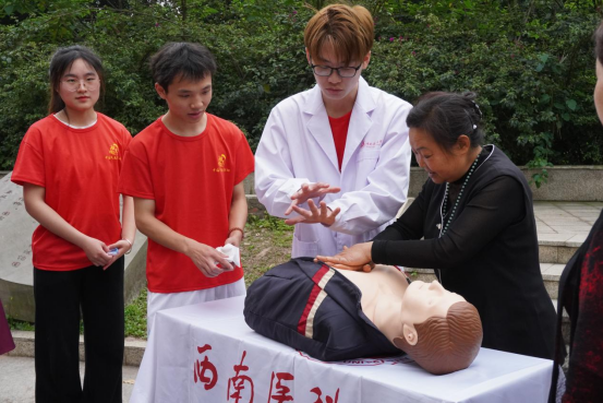 首先,队员杨文详细讲解了心肺复苏和海姆立克法的急救方法并邀请社区居民进行实践操作。接着,游正华带领志愿者们从生活实际出发,为社区居民介绍了常见的“防谣言防诈骗”知识并运用“两个凡是”维护自己的切身利益,居民普遍反映此次活动的实用性很高。