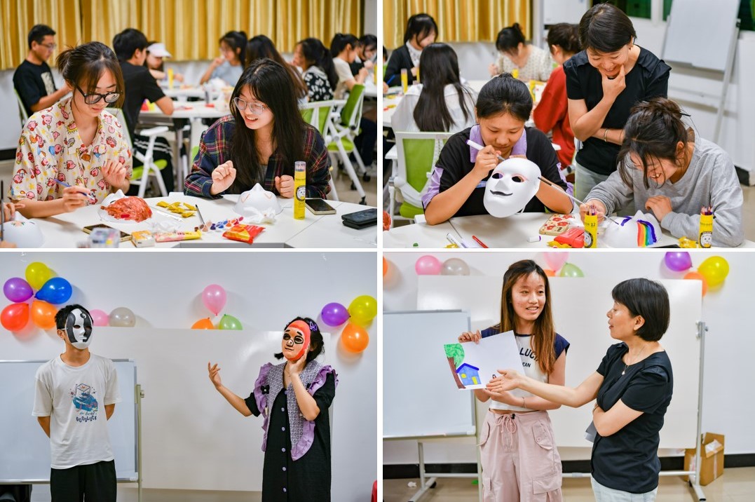 线下活动为团体心理辅导,设3个子活动,分别为“DIY面具”“房树人绘画”“集体涂鸦”活动。在舒缓的音乐中,同学们“DIY”手中的白色面具,绘出专有“头像”,并戴上自己的涂鸦面具;通过参与“萝卜蹲”游戏,寻找伙伴,用与众不同的方式结识新朋友。随后,同学们在白色卡纸上完成“房树人”绘画,徐浩岚老师为他们讲解“房树人”中所反映的人格特点和心理状态。最后,在轻松愉快的音乐中,同学们在白色涂鸦板上集体涂鸦,释放内心压力。