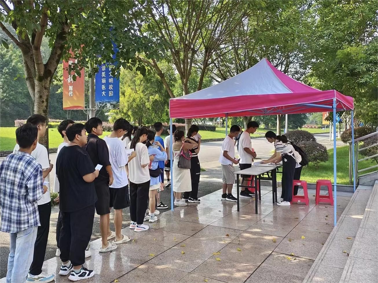 以学生成长为牵引,主打“育人牌”。活动现场,即使烈日炎炎,每个点位都排起了长龙,师生们依旧井然有序地完成了打卡,收获满满的他们都笑意盈盈地赶往下一个点位;摆点的志愿者们分工明确,有的负责答题,有的负责盖章,同时还不忘为师生们解疑答惑,在利用空闲时间阅读校园文化手册后,也会向前来打卡的师生介绍相关景观的历史文化。当看到有很多人都是出于喜爱来参加两个校区的打卡时,新闻社•新媒体运营中心社长、2022级预防医学4班杨璐的自豪感油然而生,“由于此次活动正值两届学生军训和新生入校等时间节点,我又是第一次负责这样的大型活动,每天军训的间隙要做好志愿者招募和值班安排、活动通知发布和场地申请等事项,还要及时与老师沟通、调整活动细节,处理诸如志愿者临时空缺等突发情况,我和团队成员们都认为自身统筹协调、随机应变、沟通表达等能力得到极大提升。”