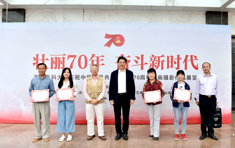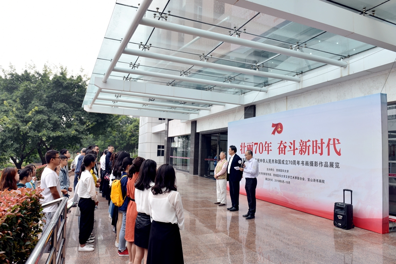 为献礼新中国成立70周年,今年5月起,学校开展了庆祝新中国成立70周年文学艺术作品征集活动,广大师生、校友积极参与、踊跃投稿,活动共收到150余件作品。经学校组织专家多轮评审后,评选了70幅优秀作品入展。此次展览分为书画展区和摄影展区,现场还设置了创作区,师生可以现场进行书法、绘画、手工等创作。
