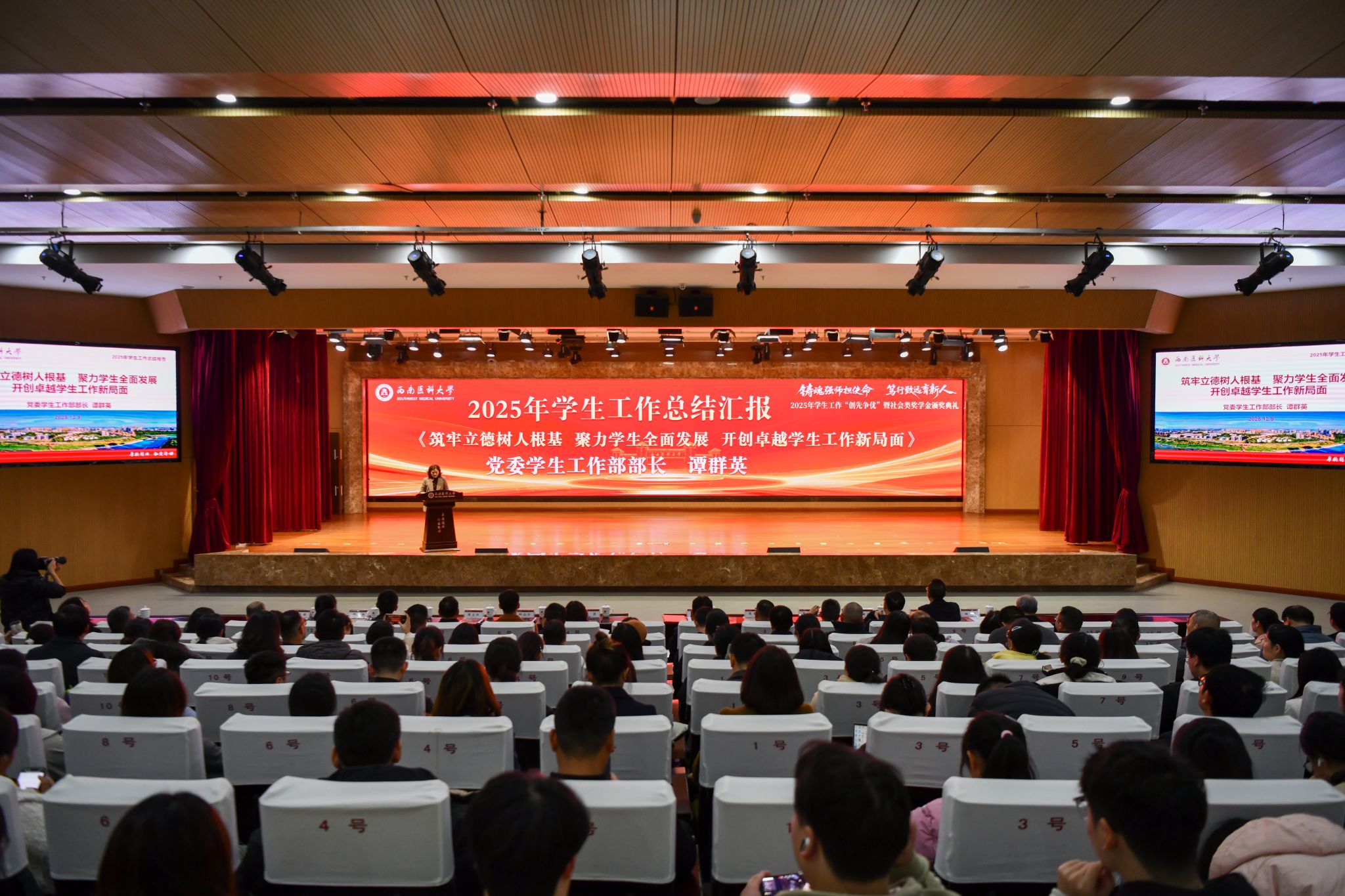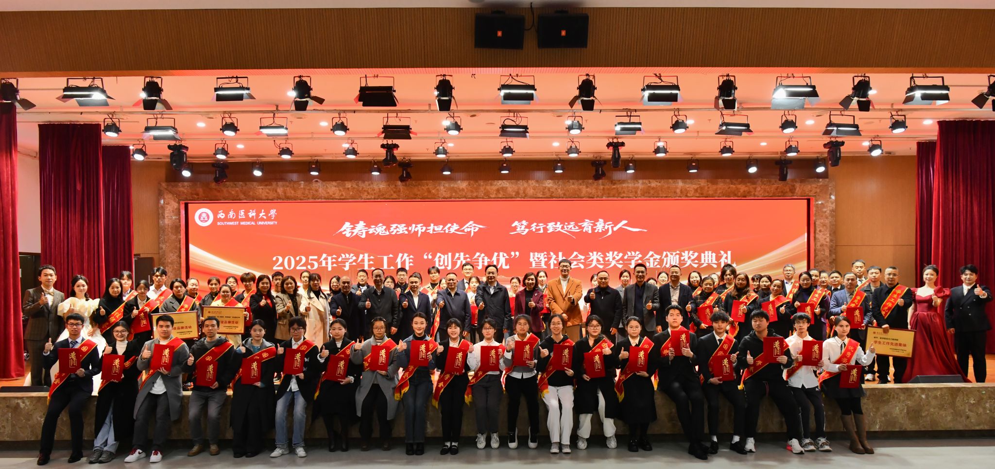 12月9日晚,学校在城北校区第一学术报告厅举行2025年学生工作“创先争优”暨社会类奖学金颁奖典礼,活动以“铸魂强师担使命 笃行致远育新人”为主题。学校党委书记张春祥,党委副书记、校长何涛,党委副书记蒋通荣,党委副书记、纪委书记张永红,党委常委、副校长聂敏海、江涌、周翔宇,党委常委、组织部部长柏珂,党委常委、宣传部·统战部部长冯天明,各相关职能部门和二级院系负责人,学工系统全体人员,泸州老窖股份有限公司、四川宝瑞雅珠宝有限公司等捐资助学企业代表,受表扬集体与个人代表、学生代表近800人参加。