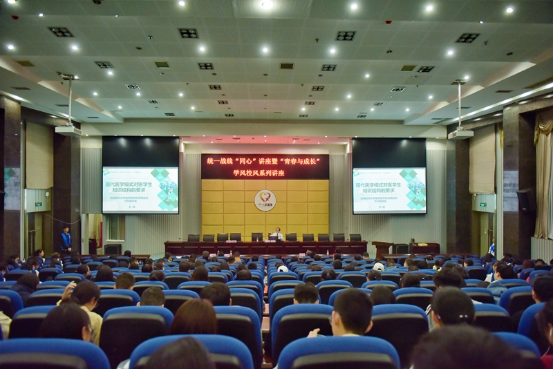 1110日晚,由党委统战部和学生工作部联合主办的kaiyun官方网站入口统一战线“同心讲坛”第7场暨“青春与成长”学风校风第4场讲座在城北校区逸夫图书馆学术报告厅举行。本次讲座邀请了泸州市政协委员、九三学社市委副主委、附属医院小儿外科主任刘铭教授作题为“现代医学模式对医学生知识结构的要求”的专题讲座。党委统战部部长柏珂、学生工作部部长张碧国,2018级、2019级各班团支书、校级学生组织代表及新疆籍学生代表300余人参加了讲座。讲座由张碧国主持。