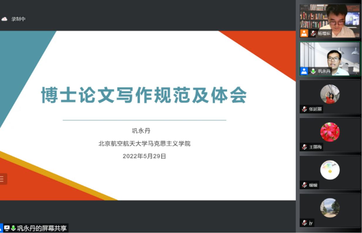 2022年5月29日,kaiyun开云官方线上举办“研究生学位论文指导系列讲座”第一讲。本次讲座聚焦博士学位论文写作,由开云官网博士毕业并分别获得“首届全国高校马克思主义理论学科优秀博士学位论文”、“kaiyun开云官方优秀博士学位论文”的北京工业大学kaiyun开云官方副教授陈艳飞、北京航空航天大学助理教授巩永丹两位老师做分享。讲座以腾讯视频线上方式进行,学院博士生、部分硕士生以及校内外其他同学约320人在线学习。学院副院长杨增岽教授主持了讲座。 陈艳飞副教授以“博士学位论文写作的三境”为主题,围绕博士论文写作历程,从论文选题确立、初稿撰写以及修改完善三个环节就如何撰写学术论文进行了精彩的讲授。陈老师认为博士论文选题要以“高”“尽”“独”为遵循,养成关注各类学术信息的良好习惯,并善于在研究中确定研究方向。同时在论文撰写过程中,要从核心概念界定、研究框架确立、写作资料搜集等方面下足功夫。最后,陈老师还为同学们介绍了PROCESS ON等实用的论文写作与分析工具。 巩永丹助理教授以“马克思主义理论学科博士论文写作规范”为主题,以马克思主义基本原理专业博士论文写作为例,提出“阅读经典是基本功,选好题目是硬道理,用好文献是要选择,守好规范是大前提,选对方向是关键点,最终通过是总目标”的论文写作要求。巩老师提出阅读经典的三层次即拓宽阅读的面,确定阅读的点,连接阅读的线,同时指出在选用文献的过程中对最新研究成果要做到批判性吸收。最后还从论文写作规范、送审、提交等方面提出了需要注意的问题。 两位分享嘉宾还认真选答了参会同学的的提问。整个讲座受到广泛好评。 讲座最后,杨增岽老师对两位老师的分享交流表示衷心感谢,从四个方面总结概括了分享嘉宾在写作博士论文过程中的共性优点;结合近年来博士学位论文评阅与论文抽查的情况做了介绍,认为不同的目标要求和自觉意识决定了对待学位论文的不同态度;指出博士学位论文写作从打心底里喜欢做学术研究进而确立一个好的选题作为开始,是博士生的学养、学识、学风与研究能力的集中反映,选题过程是学术旨趣、选题价值、个人能力、导师关注等多重因素有机结合从而做出最佳决定的过程。杨老师同时指出,研究方法、研究思路与研究结论要经得起逻辑推敲,要在循序渐进上下功夫,任何“一招鲜”或“绣花拳”都是难以为继的;勉励大家进一步增强学位论文的重视度,尽早进入写作最佳状态。杨老师表示,学院将进一步为博士生写好学位论文提供积极指导,后续还将陆续采取多种形式深入开展专题论文写作指导。