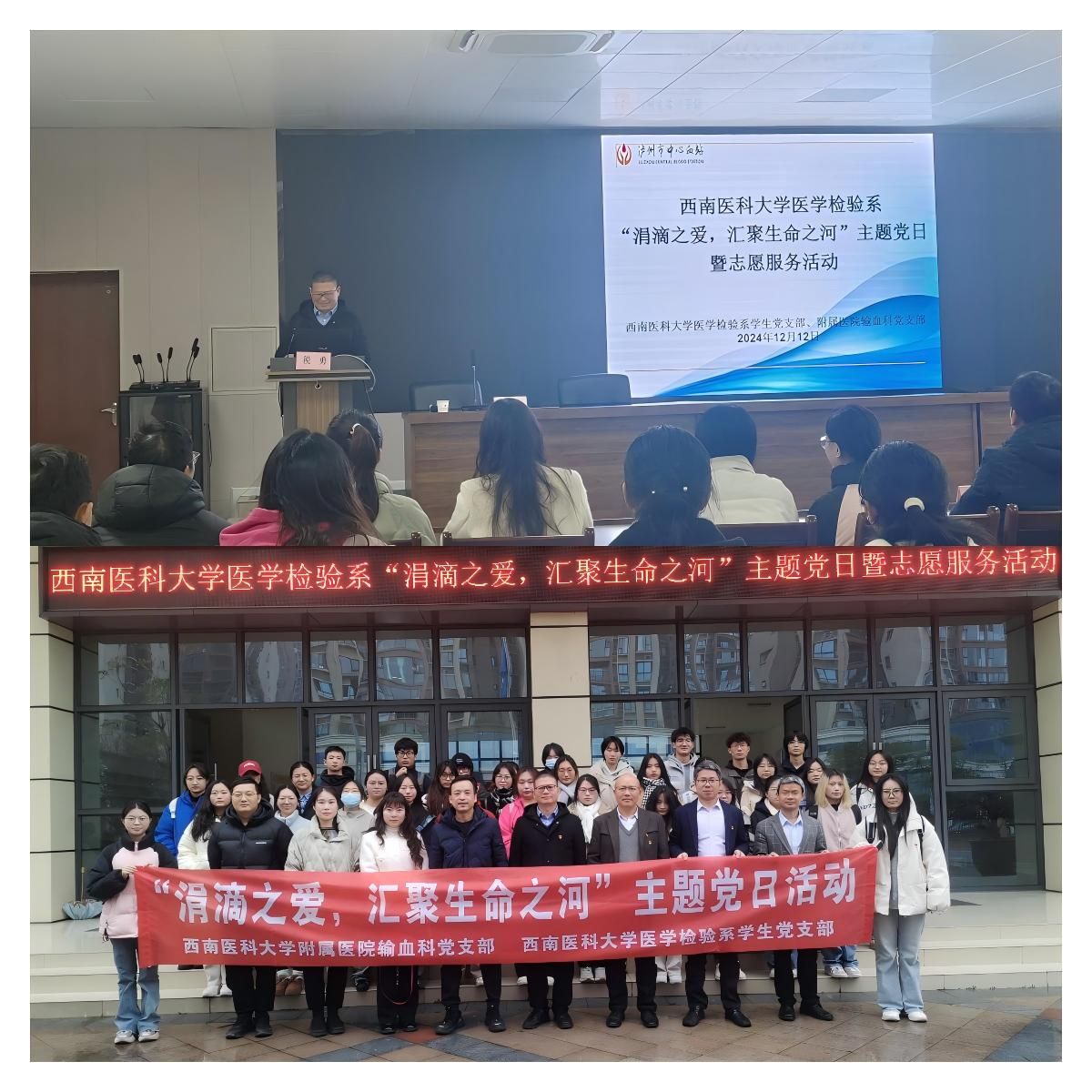 12月12日,医学检验系学生党支部联合输血科党支部前往泸州市中心血站开展“涓滴之爱,汇聚生命之河”主题党日暨志愿服务活动。医学检验系党总支书记吕春、输血科副主任及党支部书记张洪为、学生党支部书记李尚学、泸州市中心血站副站长税勇,以及两个支部党员、发展对象和入党积极分子共50余人参加。活动由李尚学主持。