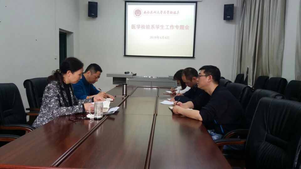 4月4日,医学检验系在忠山校区跃进楼召开学生工作专题会,医学检验系主任陶华林、党总支书记黄君、党政办公室主任李咏、学生科科长陈勇和团总支书记陈思参会,黄君主持会议。