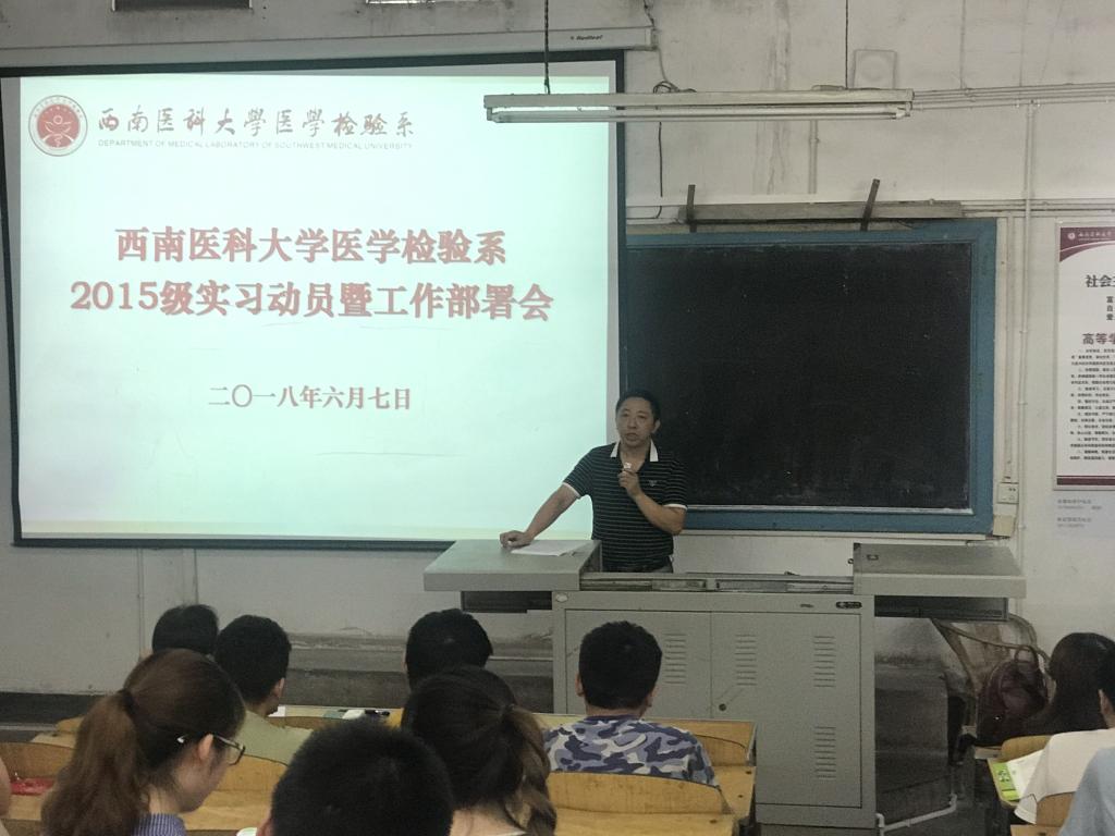 2018年6月7日上午10:00,医学检验系于忠山校区临床十阶梯教室召开2015级实习动员培训暨工作部署会。系主任陶华林、系党总支书记黄君、系党政办公室主任李咏、系学生科科长陈勇及2015级全体同学参会,会议由黄君主持。