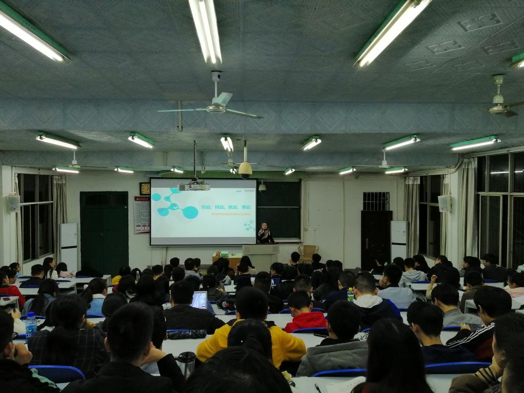 为进一步帮助学生树立正确的就业观和择业观,使广大学生了解就业形势,就业政策,转变就业观念,提高就业技能,医学检验系充分利用毕业年级学生回校参加双选会的契机,于11月15日晚,在忠山校区六阶教室开展了就医指导讲座,本次讲座由医学检验系学生科科长余郭莉、美特生物技术有限公司副总孟柯杉主讲。