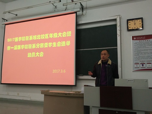 2017年3月6日(星期一)中午13:00时,检验系城北校区全体学生在明理楼101教室召开了全体学生大会暨新一届团总支学生会选举动员大会,检验系学生科科长陈勇主持会议。