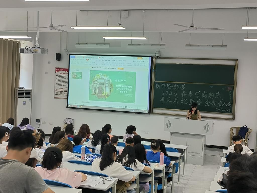 6月13日上午,医学检验系在学海楼313召开2023年春季学期期末考风考纪暨安全教育年级大会,会议由医学检验系辅导员刘岩恕主讲,2021级和2022级全体同学参加。