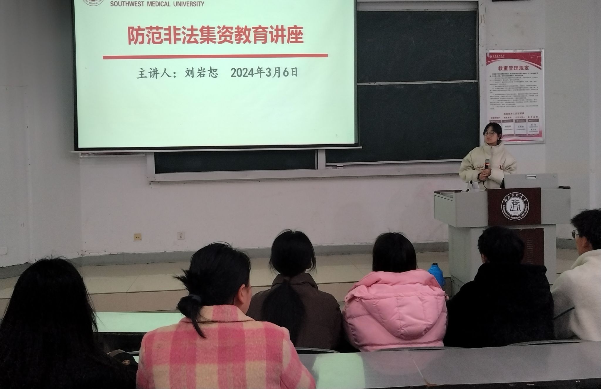 为进一步落实上级文件精神,提高同学们法律知识⽔平和风险防范意识,培育其理性投资、风险自担的正确理念,3月6日上午,医学检验系在明理楼105举办防范非法集资教育讲座。本次讲座由辅导员刘岩恕主讲,2022级和2023级全体学生参加。