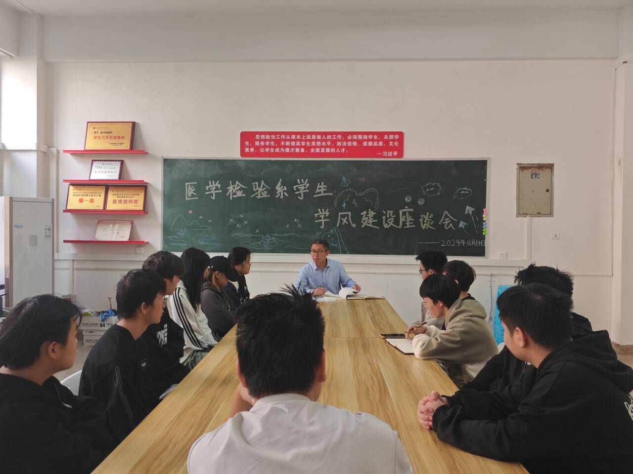 11月14日中午,医学检验系2024年秋季学生学风建设座谈会在明理楼1-6举行,学生科科长李尚学、医学检验技术专业2022级、2023级学生代表参加。