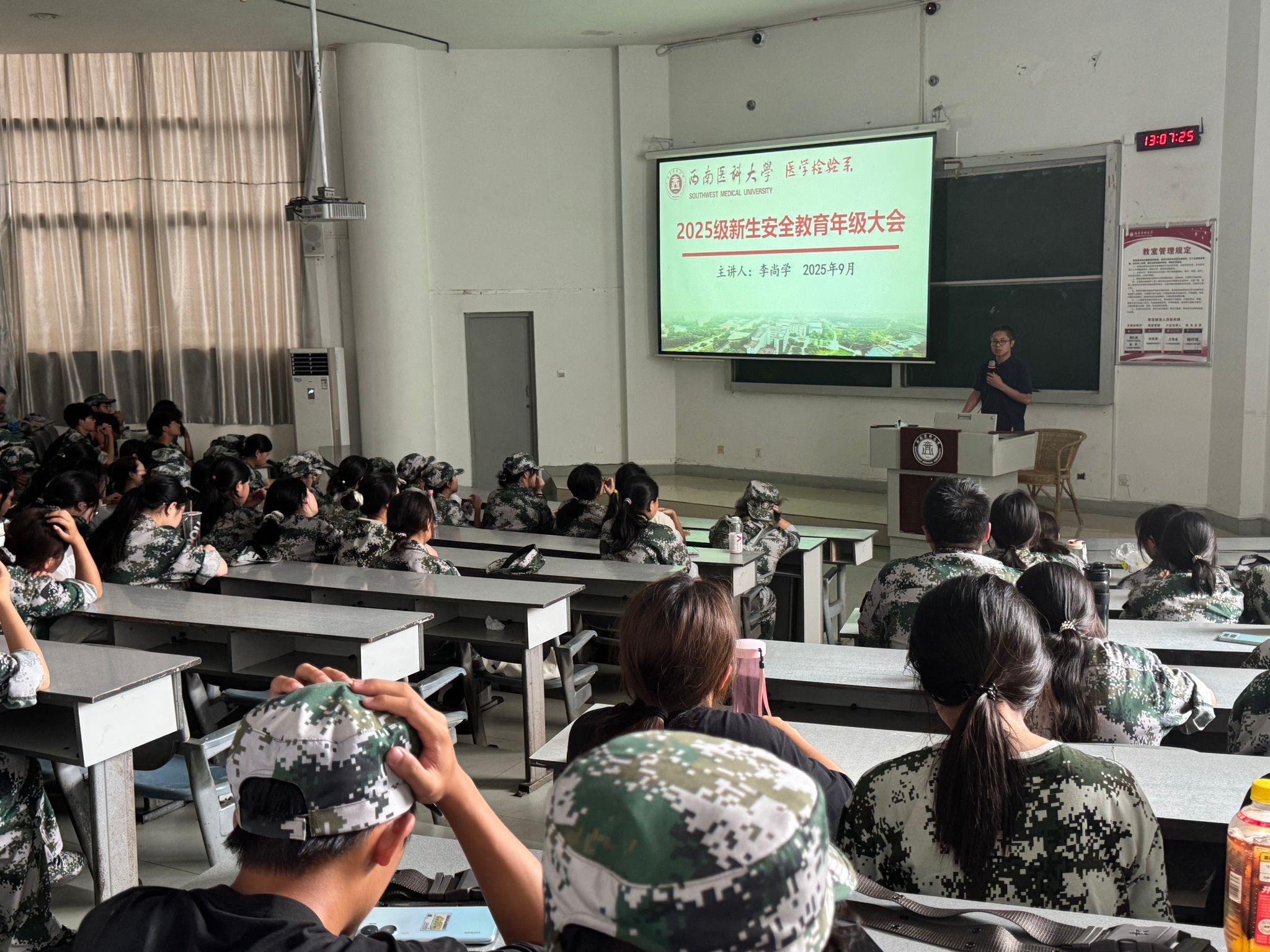 为切实增强2025级新生安全意识,筑牢校园安全防线,9月11日,医学检验系于明理楼105教室召开2025级新生安全教育年级大会。安全教育年级大会由学生科辅导员李尚学主讲,辅导员刘岩恕和2025级全体新生参加。