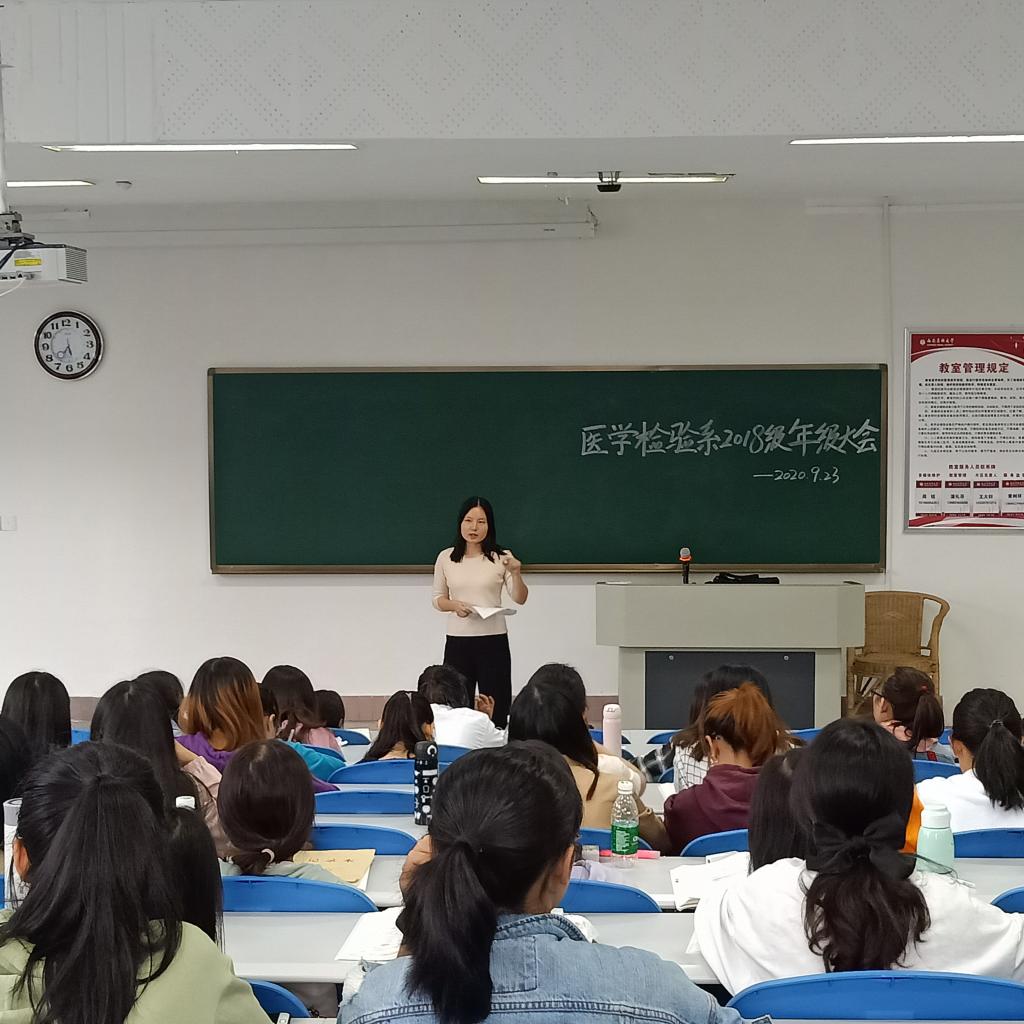 9月23日,医学检验系在忠山校区第16阶梯教室召开2018级新学期年级大会,系学生科副科长何顺姣及2018级全体同学参加会议。