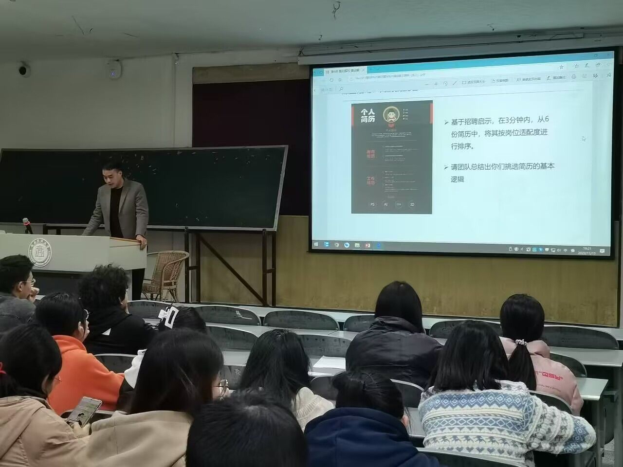 培训分两部分。第一部分,求职简历的制作;第二部分,面试技巧与礼仪。刘泸通过对一份学生制作的简历进行了详细的解析,分析其存在的问题,让学生充分认识到我会在你简历的重要性和简历制作的技巧。在面试技巧和礼仪部分,刘泸从面试着装、姿势、距离、语言、答问等方面进行了仔细讲解,他强调,面试时要充分尊重面试官,是展示自己专业能力和综合素质的重要机会,通过展示获得面试官的青睐。