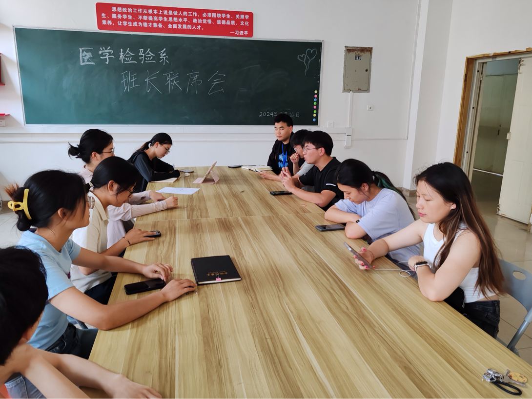 为了切实维护广大学生的利益,保障学生学习、生活,营造良好的校园氛围,为学生提供更好的管理服务,6月4日,医学检验系在明理楼学生科办公室召开2024年各班班长联席会。