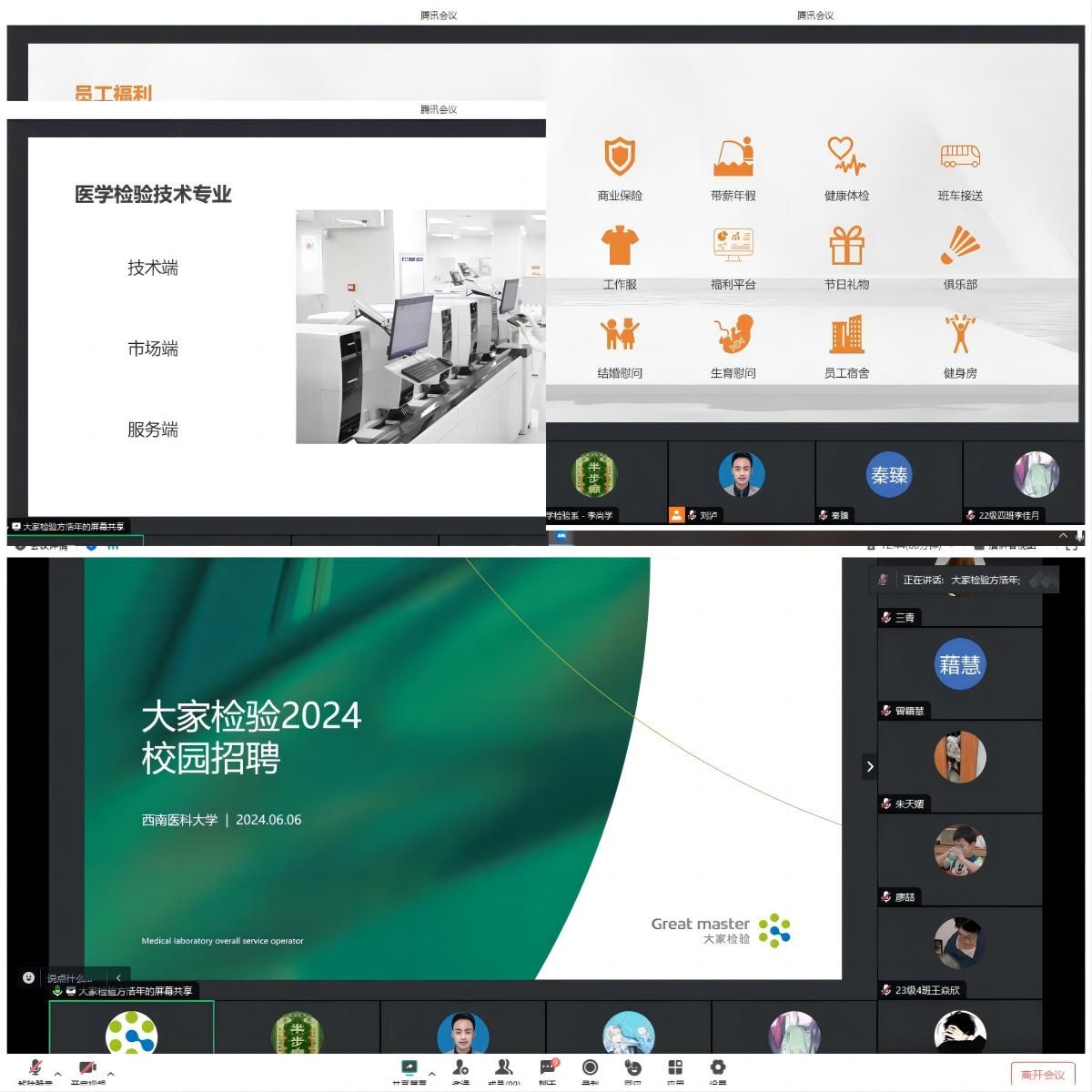 为进一步抢抓就业机遇,不断拓展就业岗位,为毕业生提供更多的就业机会,6月6日晚,医学检验系通过线上方式举办四川大家医学检测有限公司专场招聘宣讲会。四川大家医学检测有限公司人力资源部经理方浩年主讲,2024届毕业生、2021级实习生和部分低年级同学参加。宣讲会由学生科辅导员刘泸主持。