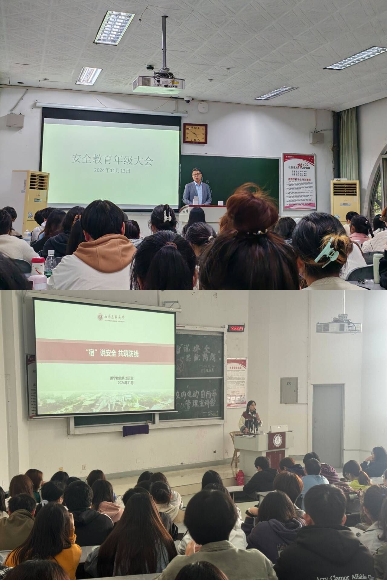 11月13日下午和14日中午,医学检验系在忠山校区图书馆502教室和城北校区明理楼105教室分别召开2024年秋季学期期中安全教育年级大会,医学检验系学生科科长李尚学、辅导员刘岩恕及两校区各年级学生参加。李尚学和刘岩恕从交通安全、社交安全、网络安全、消防安全、防诈防骗等五个方面进行了强调,要求大家出行时要遵守交通规则,行走或驾车时注意力高度集中,在社交过程中警惕陌生人,网络交友需要特别谨慎,对不明情况应及时报告;要依法使用网络,不得在网络上发表不当言论,不跟风,不带节凑,遇事应理性分析,防止掉入网络诈骗陷阱,对网络诈骗的常用手法,如网络刷单、网络投资、网络传销、网络伪装身份等要学会判断、理性处理,无法判断时应该报告辅导员或报警;严禁使用违规电器,不得在寝室使用明火和抽烟,人离开寝室时必须断电关门,不得在寝室饲养宠物等。