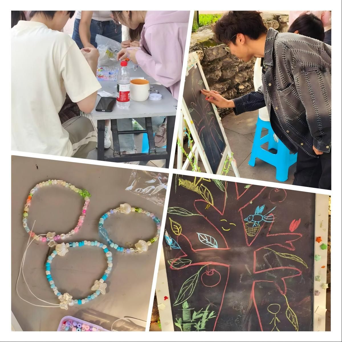 活动现场,彩色珠串与毛线成为“情绪翻译官”。同学们围绕“勇气”“希望”“自由”等关键词,用不同颜色的珠串编织独一无二的能量手环——红色代表热血与活力,蓝色倾诉沉静与思索,绿色象征新生与治愈。有人将亲手制作的手环赠予朋友,让沉默的手工品成为传递关怀的“情绪信使”。一块巨型黑板化作“生命树干”,同学们用彩笔绘制的叶片渐渐覆盖枝头。每一片叶子都是无需言说的情绪密码,当斑斓枝叶交织成荫,一幅动态的“心灵图谱”跃然眼前,映照出当代大学生的内心光谱。同学们在现场讨论叶子的配色以及手环编织的方法,使得现场充满欢声笑语。