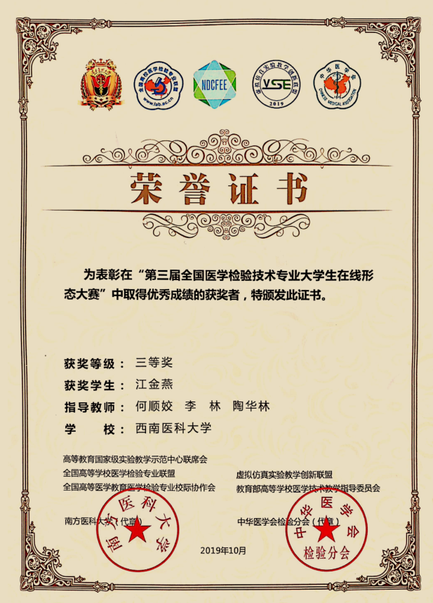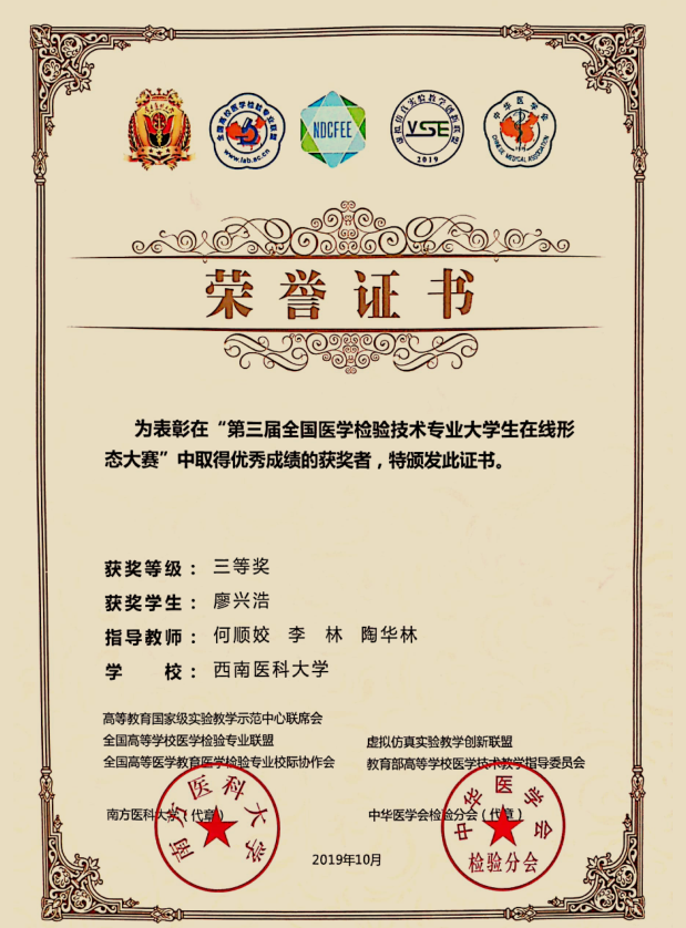 10月25日至27日,陶华林主任带队李林老师、何顺姣老师及廖兴浩、江金燕两名同学,前往上海健康医学院,参加了“2019年全国医学检验教育信息化与虚拟仿真实验项目建设研讨会、第三届全国医学检验技术专业大学生在线形态大赛暨教师虚拟仿真实验教学项目设计大赛”。在“形态学大赛”中,廖兴浩、江金燕均获得“三等奖”。