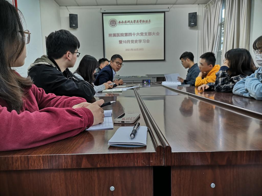 10月19日,附属医院第四十六党支部(医学检验系学生党支部)在忠山校区跃进楼医学检验系会议室召开支部党员大会暨党史学习教育专题学习会,会议采用线上线下相结合的方式进行,第四十六党支部全体党员参会。会议由支部宣传委员胡智主持。