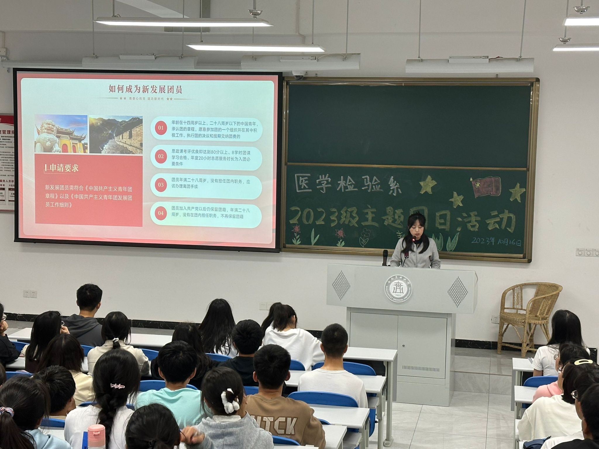为了深入贯彻落实习近平总书记关于党的建设的重要思想,10月16日晚,医学检验系在城北校区学海楼504教室举办“青春心向党,建功新时代”主题团日活动。医学检验系辅导员刘岩恕及医学检验专业2023级全体学生参加。