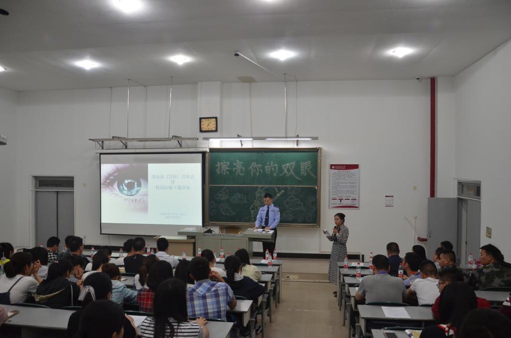 首映式结束后,泸州市公安局江阳分局北城派出所警官聂刚作了“防止网络诈骗,构建和谐校园”的专题讲座。讲座中,聂刚警官列举了泸州市近年发生的几起网络诈骗典型案例,从网络诈骗的形式、特点、防控对策等方面进行了详细讲解,以案说法,对同学们起到了良好的警示教育作用。