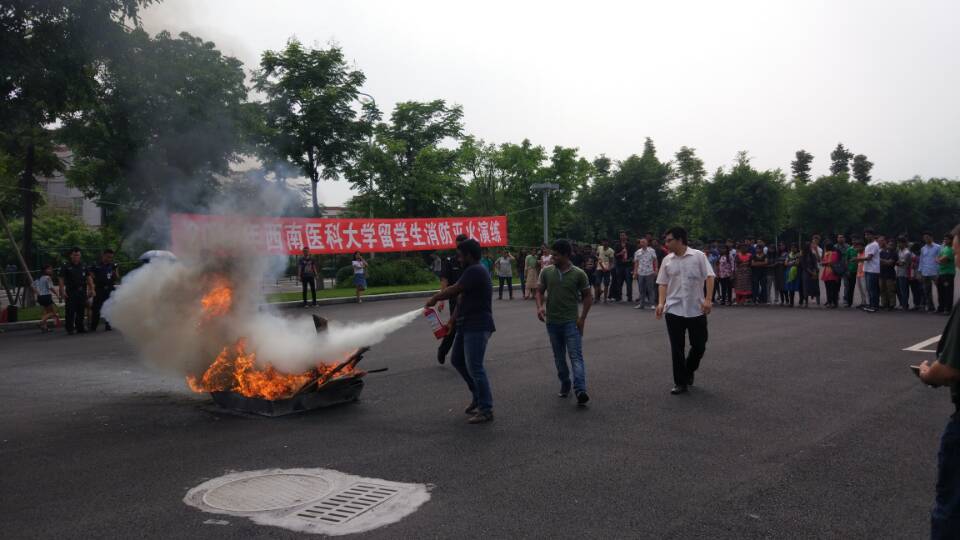 培训分别在忠山体育场和城北奥体中心进行。保卫处消防员现场讲解了干粉灭火器和室外消火栓的正确使用方法,同时介绍了起火扑救、电器电线防火及火场逃生等消防安全知识,后勤员工以及留学生代表进行了如何使用消防水枪、水带的实际操作和灭油盆火的消防演练。