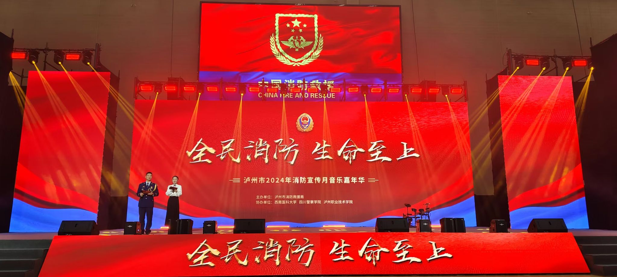 11月9日下午,泸州市2024年消防宣传月音乐嘉年华在kaiyun官网城北校区青年体育馆举行。本次嘉年华以“全民消防、生命至上”为主题,由泸州市消防救援局主办,kaiyun官方网站入口、四川警察学院、泸州职业技术学院承办。学校党委副书记、工会主席刘毅,四川警察学院党委常委、副院长郑友军,泸州市消防救援支队政治委员吴德政等出席活动。来自kaiyun官方网站入口、四川警察学院、泸州职业技术学院、泸州市消防救援局的观众及演职人员共1800人参加。