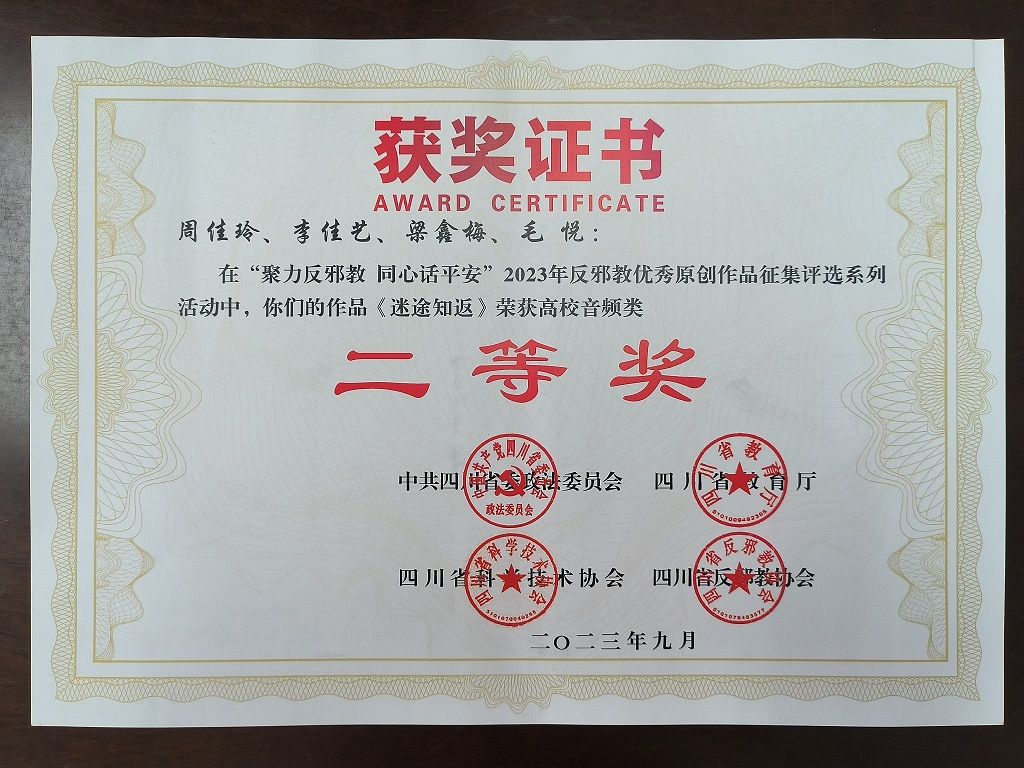 近日,由四川省委政法委、省教育厅、省科学技术协会、省反邪教协会等单位联合开展的“聚力反邪教 同心话平安”2023年反邪教优秀原创作品征集评选活动圆满收官,由kaiyun官网武装部·保卫部(处)何龙指导,人文与管理学院学生李佳艺、梁鑫梅,护理学院学生毛悦、周佳玲共同创作的作品《迷途知返》荣获高校音频类二等奖和网络人气奖。