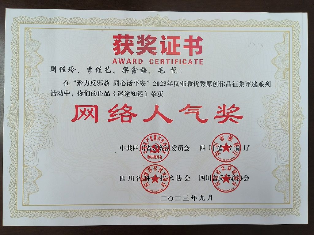 学校荣获2023年反邪教优秀原创作品二等奖和网络人气奖