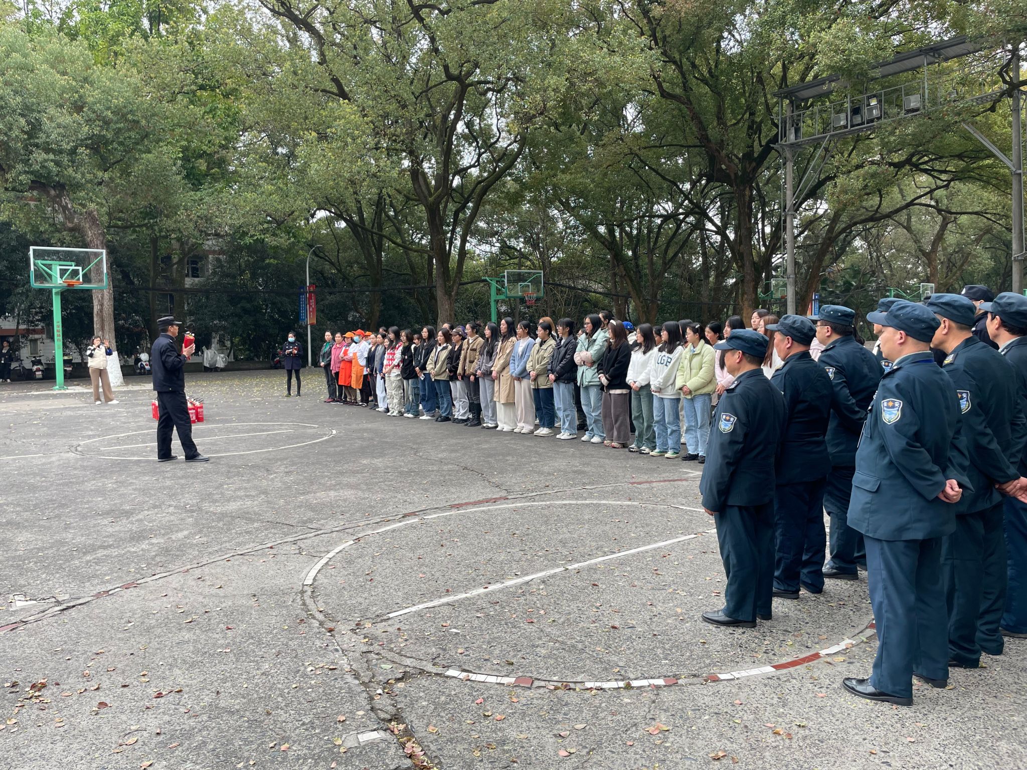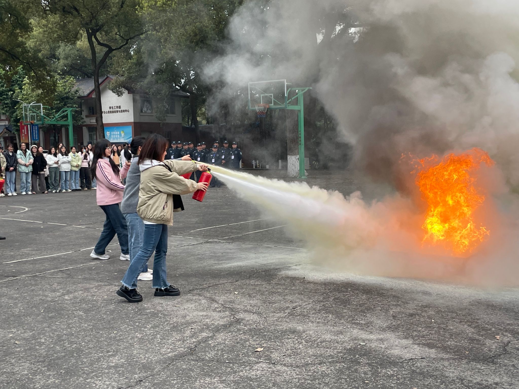 灭火演练环节,校卫队队长罗安勇介绍并演示灭火器和消防水枪的使用,在现场工作人员指导下,参培人员积极参与灭火实操演练,取得了良好的演练效果。