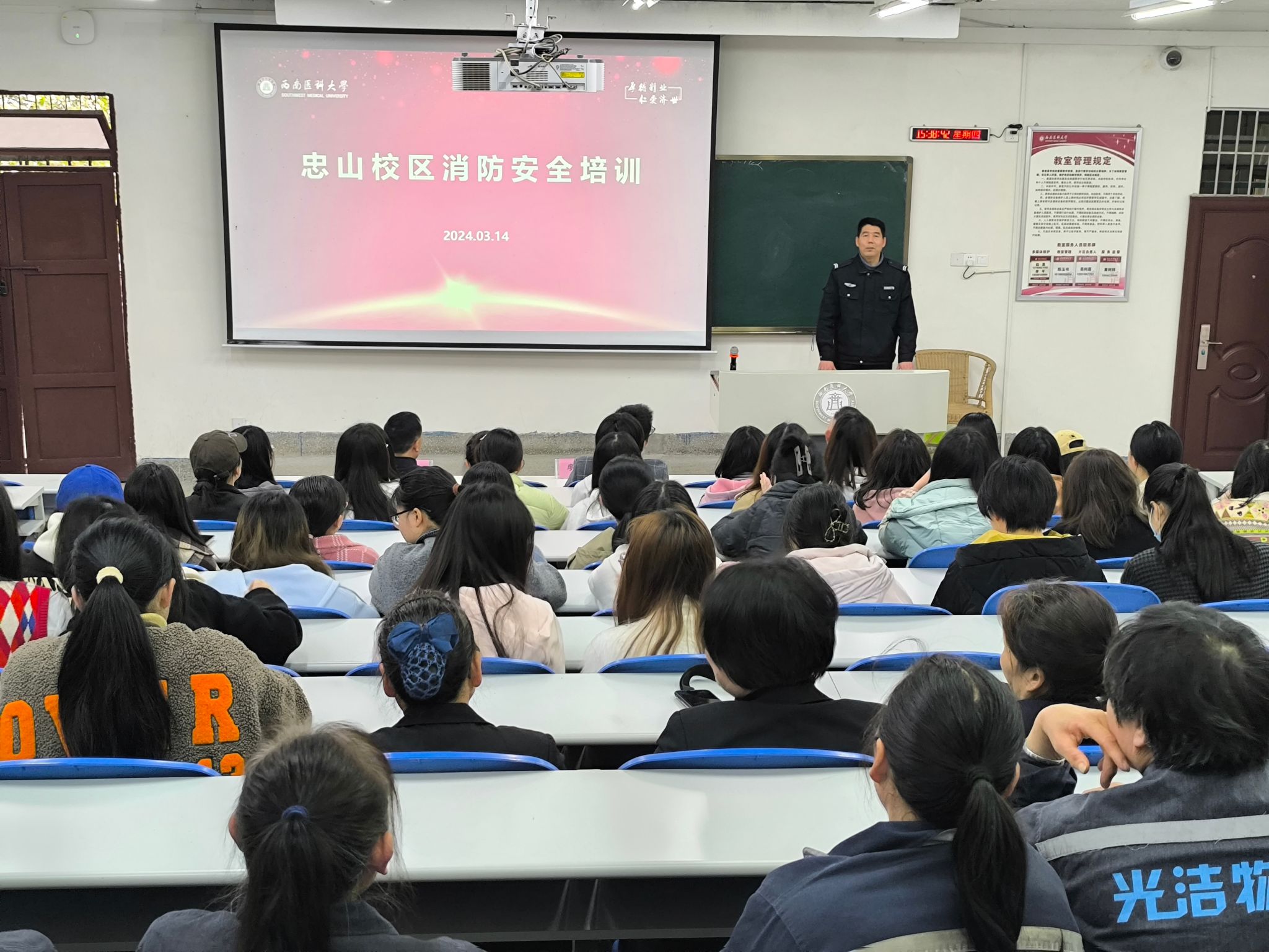 此次培训分为理论学习和灭火演练两个环节。消防安全理论学习环节,忠山校区治安科副科长廖磊从校园消防重要性、常见的校园消防安全隐患、常见的校园消防标识及器材、火灾处置与逃生、校园消防安全法律责任等方面展开培训,参培师生认真听讲,踊跃回答提问。