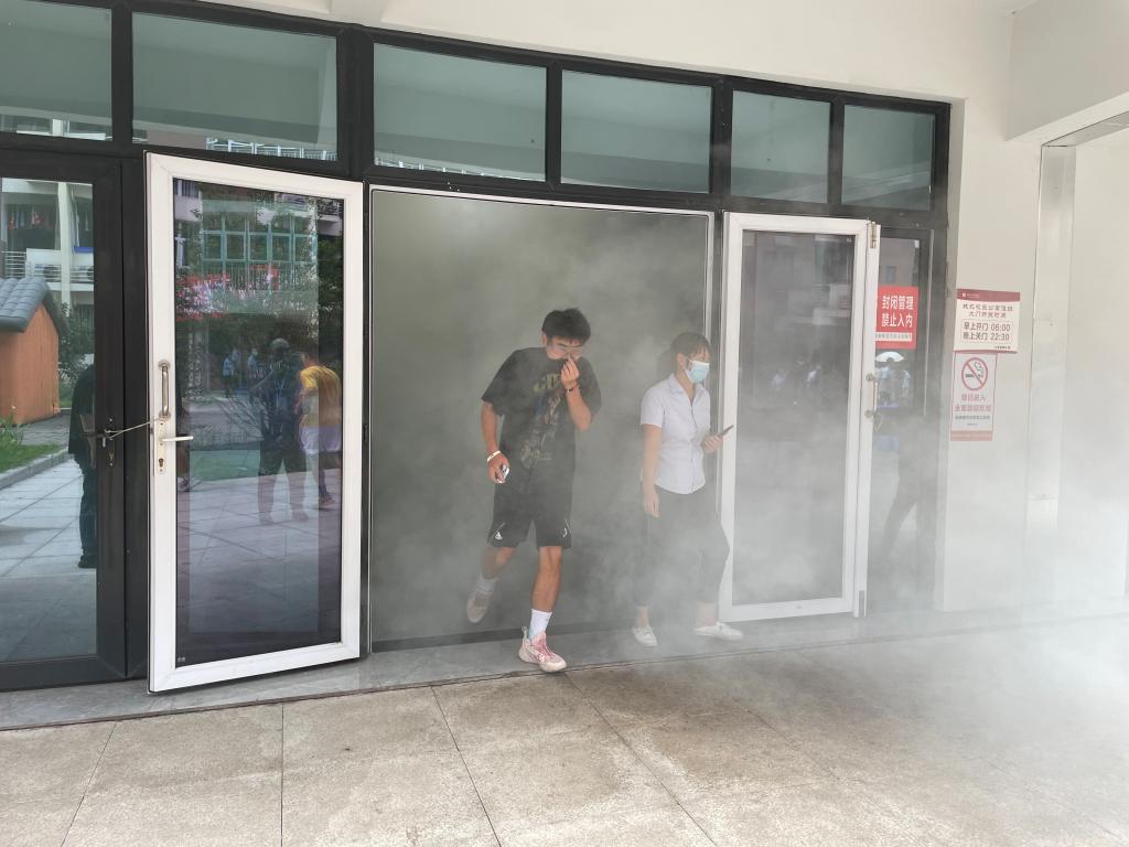 16:00,演练正式开始。校卫队员分别在29、30舍1楼、3楼点燃烟雾,假想29、30舍1楼、3楼某寝室发生火灾,随即火灾警报拉响,播音广播播放“火灾发生,请全体人员立即疏散。”接到指令后,所有疏散员、引导员立即到位,指挥、引导全体师生按照疏散路线,用手帕、纸巾等捂住口鼻,低头弯腰穿过浓烟,有序疏散。演练中,师生员工服从指挥、配合密切、行动迅速、紧张有序,仅仅3分钟,近100名师生全部疏散至安全区域。随后,保卫人员进楼逐层查看有无逗留人员,整个演练过程井然有序,达到预期效果。
