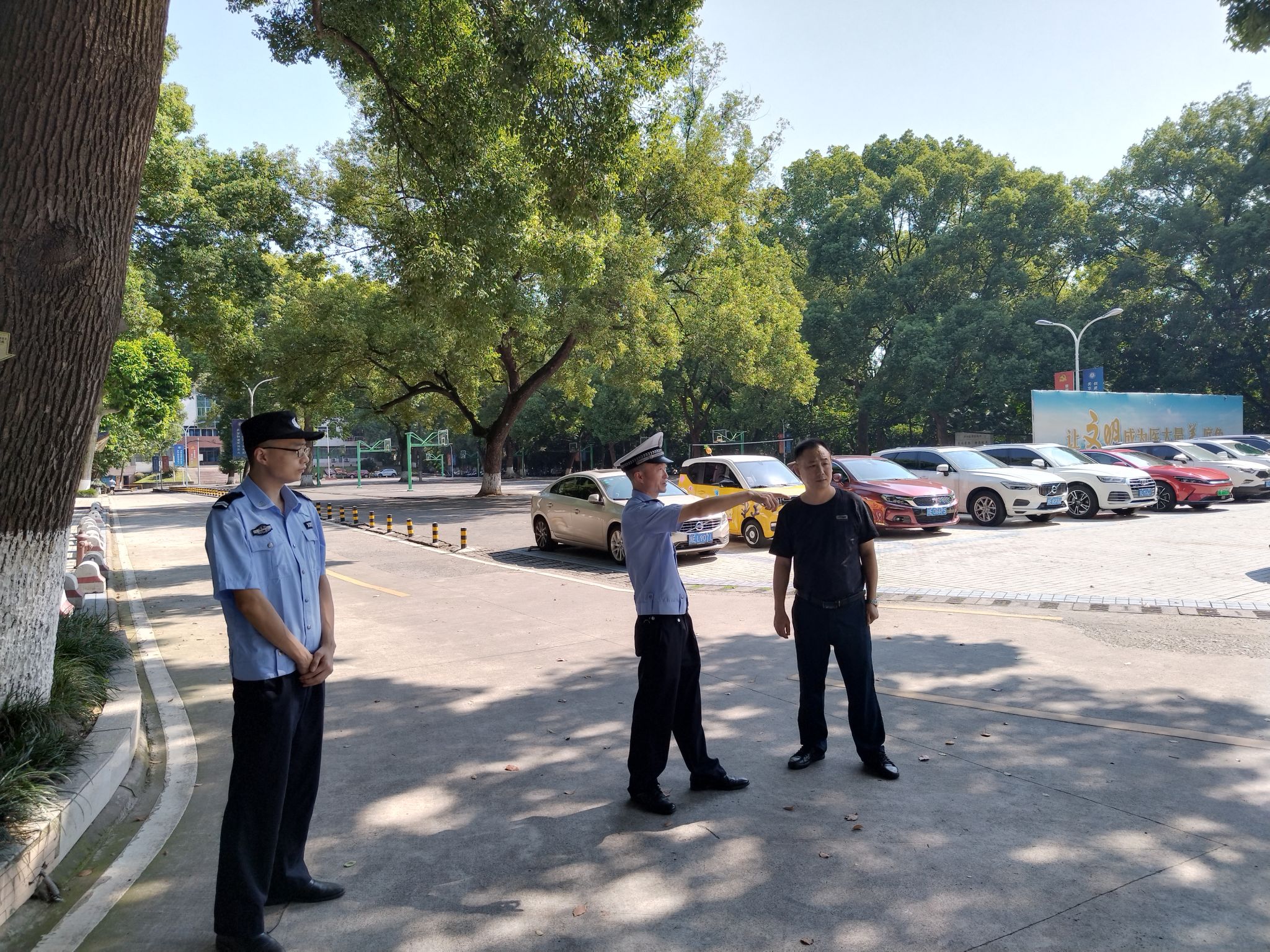 为加强校园交通安全管理,预防和减少道路交通事故的发生,9月6日上午,泸州市交警一大队江城中队中队长朱富春来校指导交通安全管理工作,保卫处忠山校区治安科相关人员陪同检查。